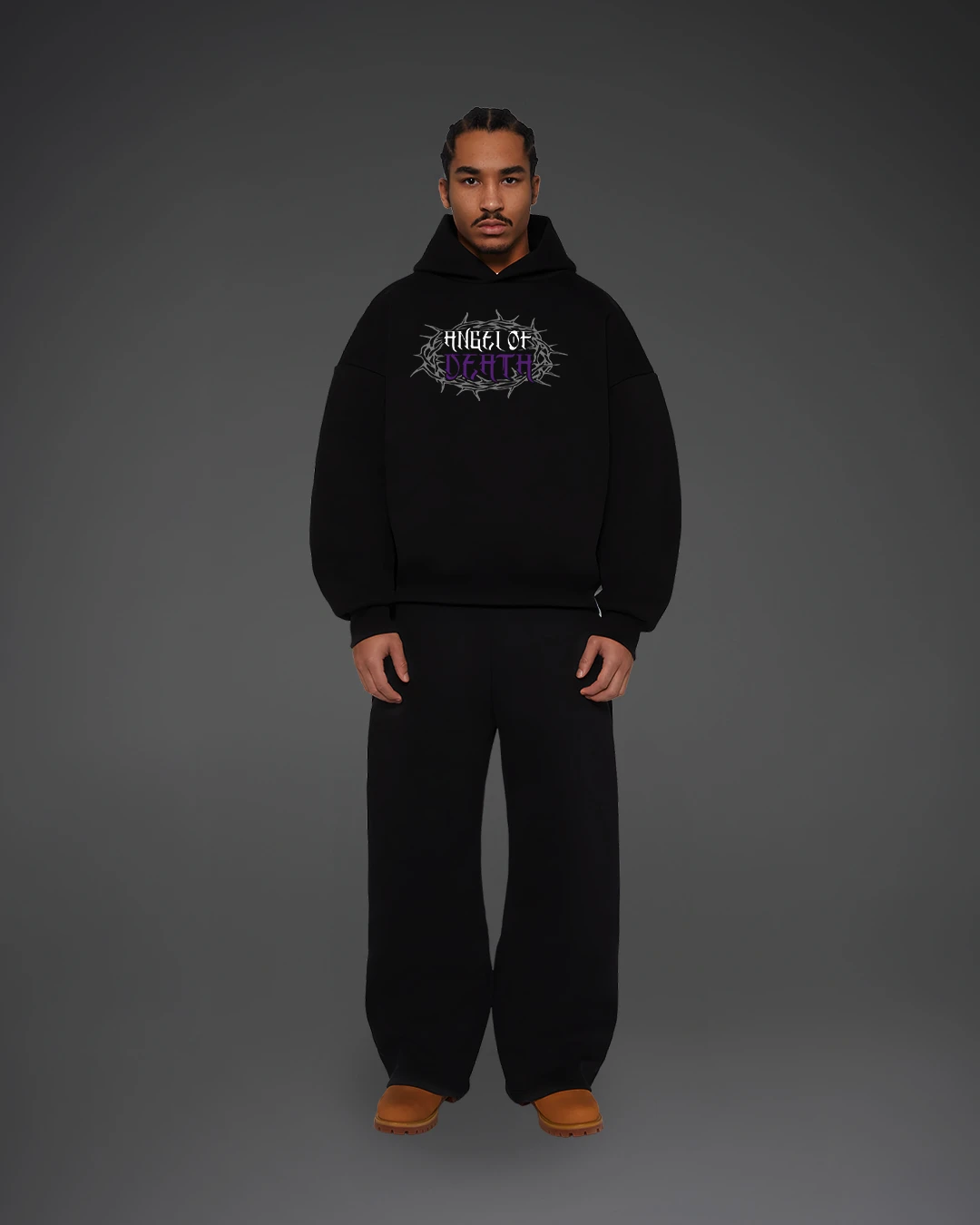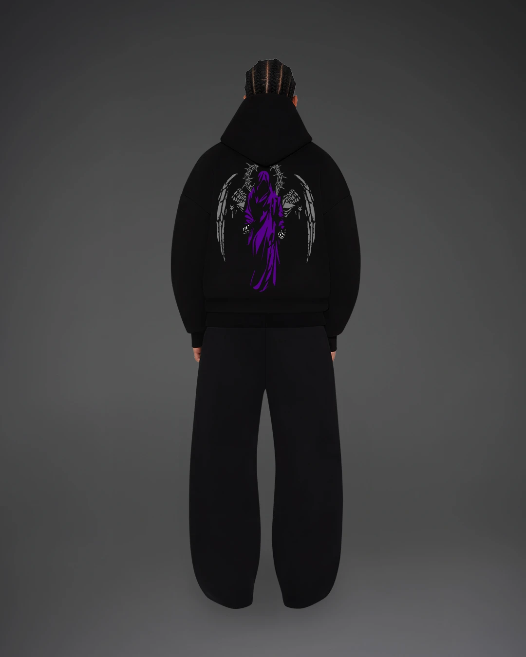 Stay bold with the Angel of Death Hoodie, crafted from premium 350 GSM cotton fleece for ultimate comfort and warmth. Featuring a striking back print of a shadowy angel with purple accents and a bold “Angel of Death” text framed by barbed thorns on the front, this hoodie is made to turn heads.