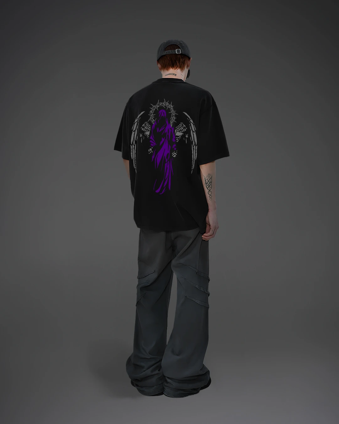 Featuring a striking graphic of a shadowy angel with vibrant purple accents and barbed thorn details, this shirt blends edgy design with streetwear appeal, perfect for those who dare to stand out.