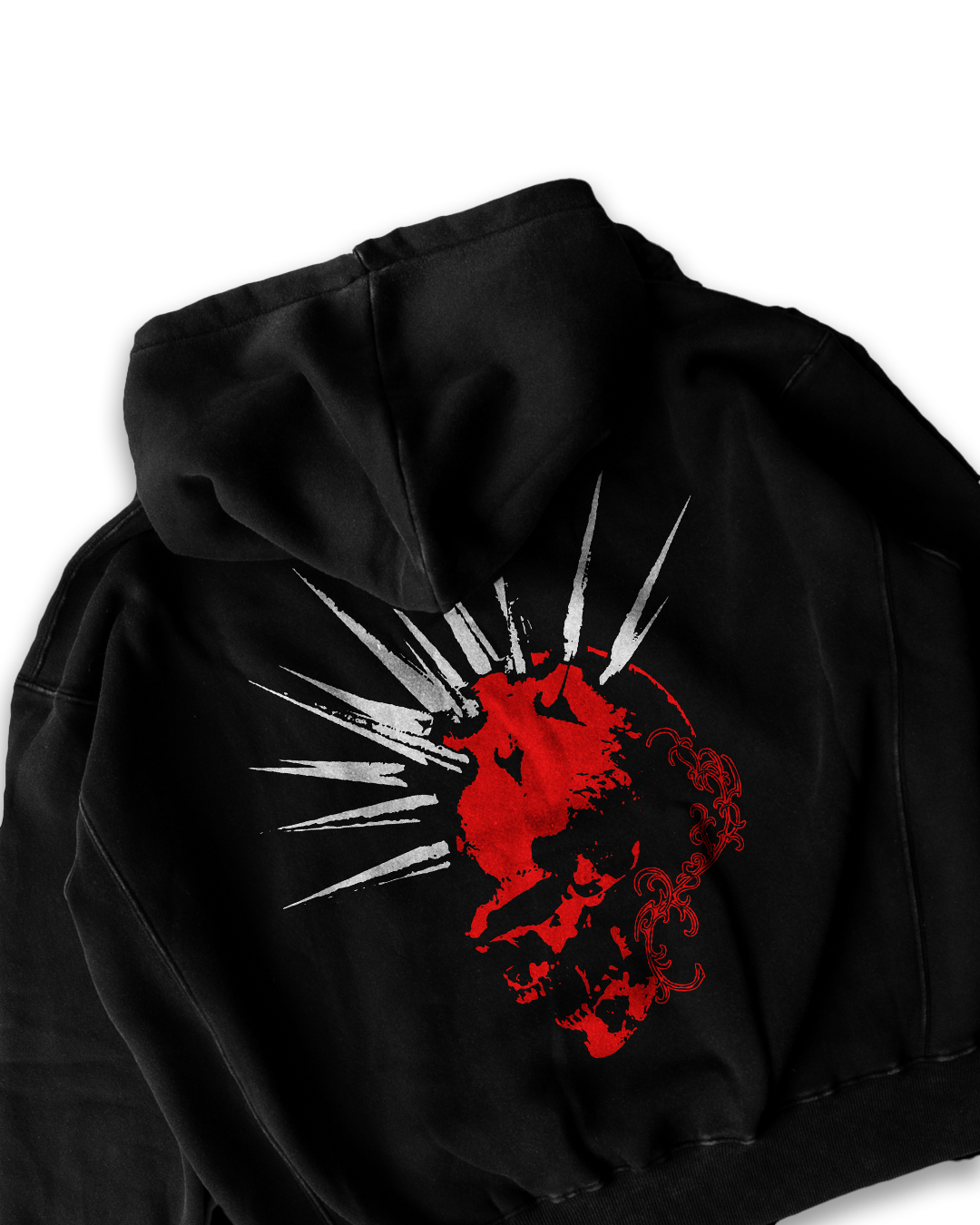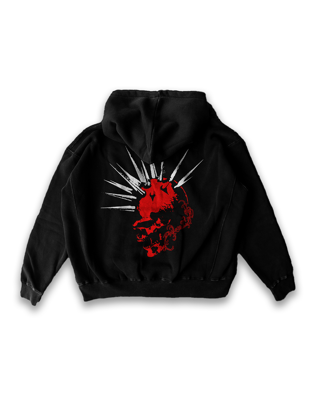 The back features a striking red skull graphic with bold white punk spikes and intricate detailing, creating a raw, edgy vibe. The oversized fit adds a relaxed streetwear silhouette, perfect for layering or as a bold statement piece.