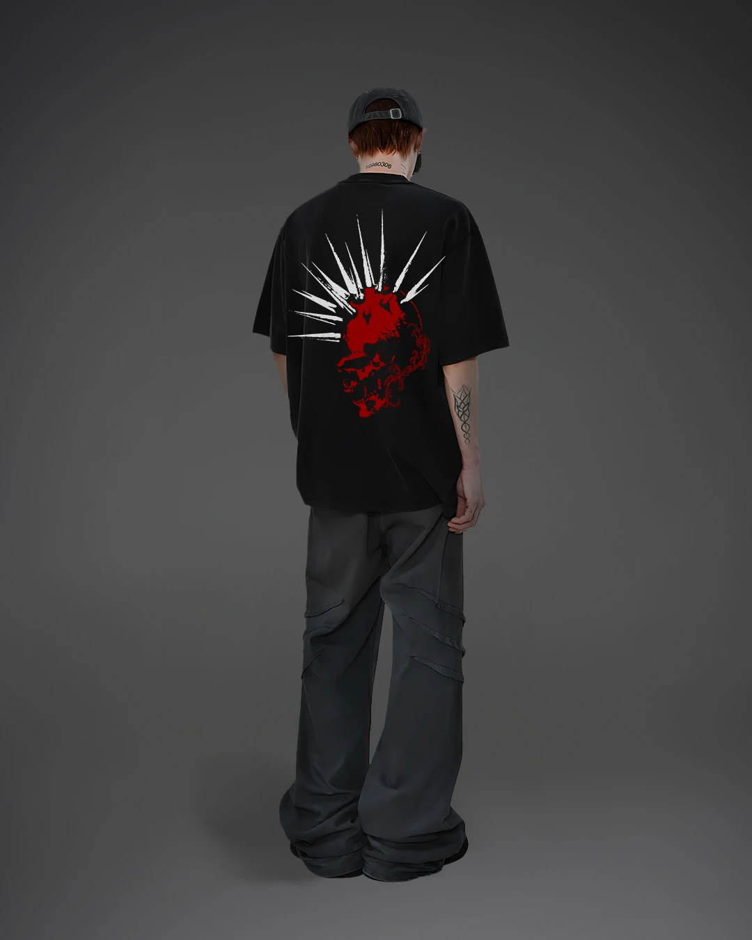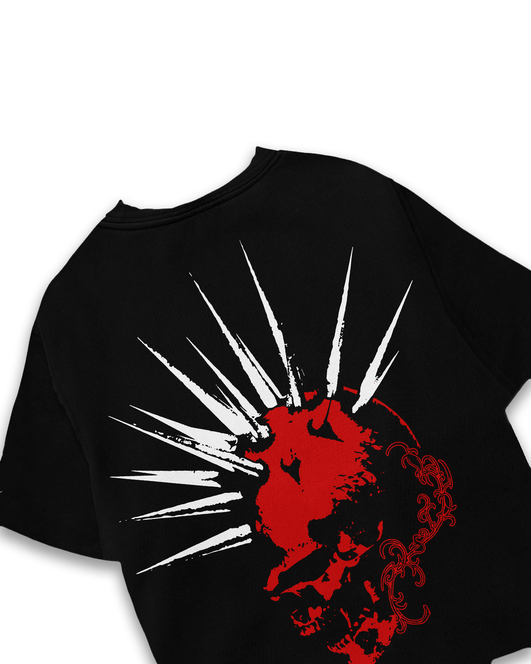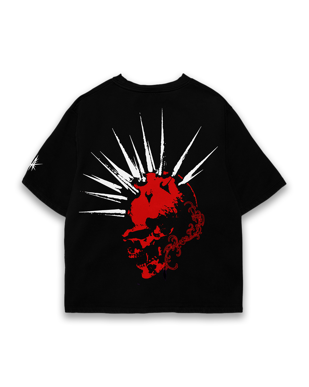 The standout red skull graphic with sharp white punk spikes gives this piece an intense, rebellious vibe, making it a perfect addition to any statement wardrobe.