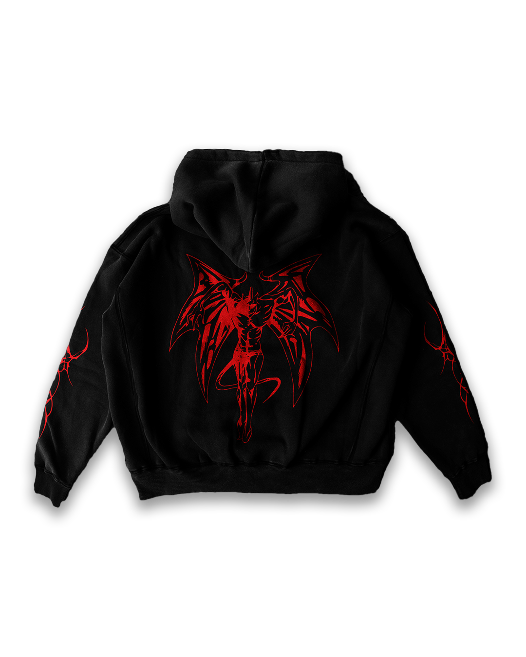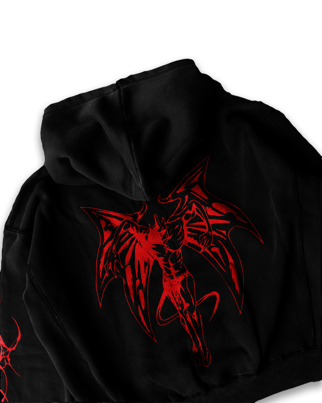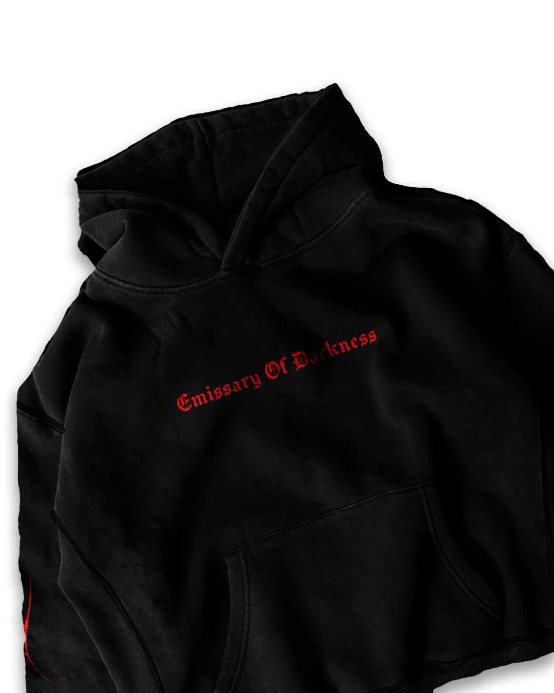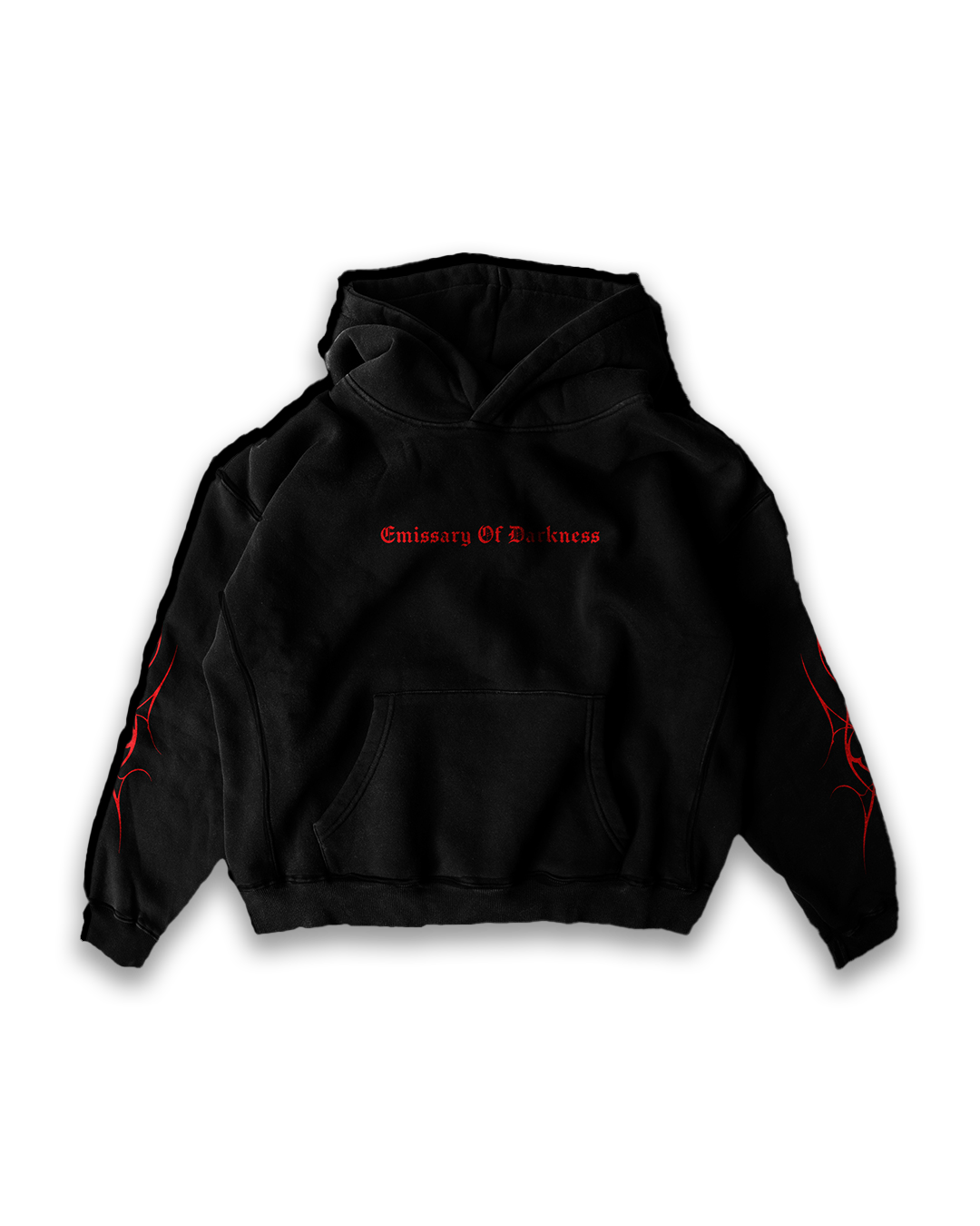 The Emissary of Darkness Oversized Hoodie – a 350 GSM heavyweight crafted from premium cotton fleece in pure black. Designed for warmth and a bold, oversized fit, this hoodie lets you embrace the shadows with undeniable edge,
