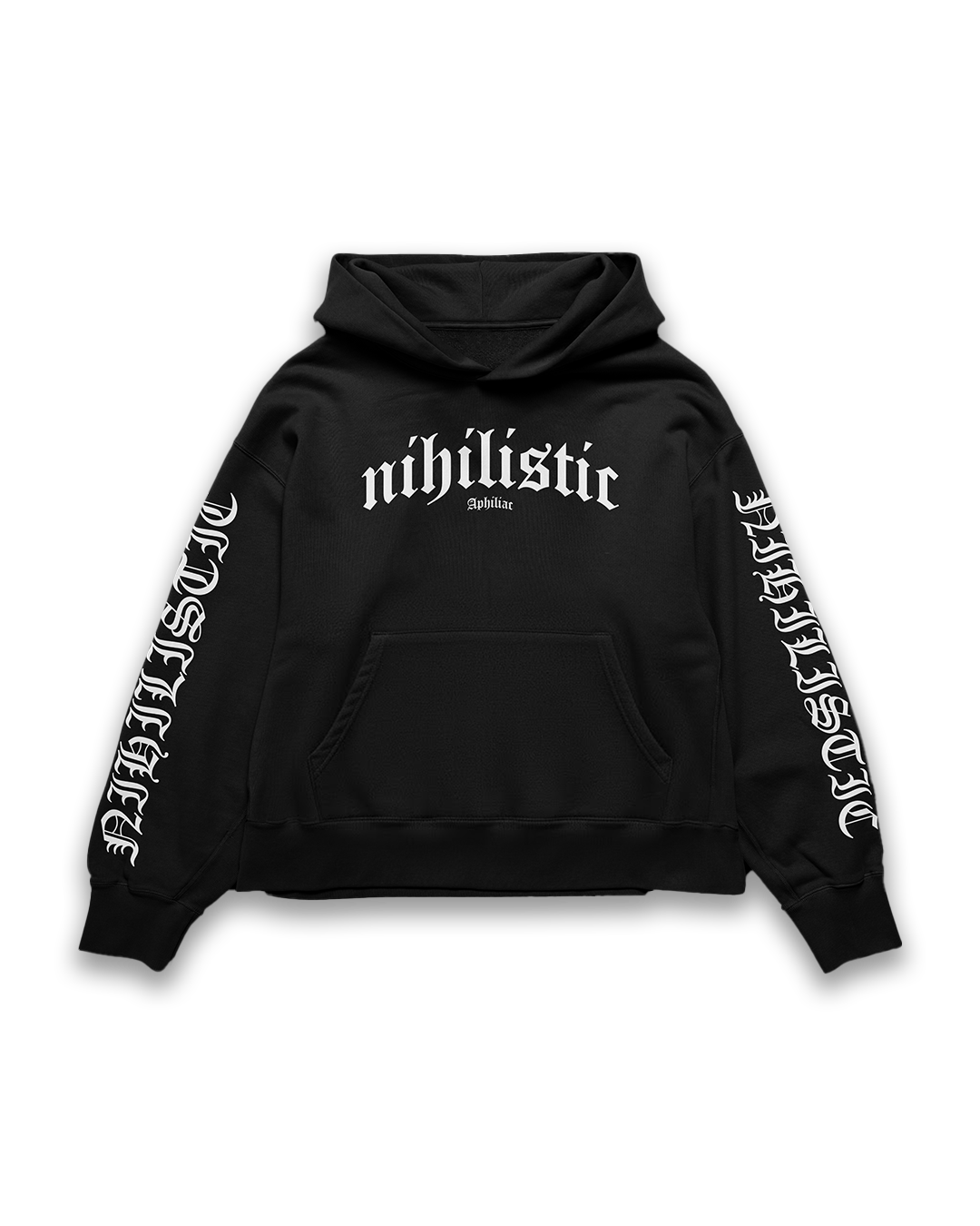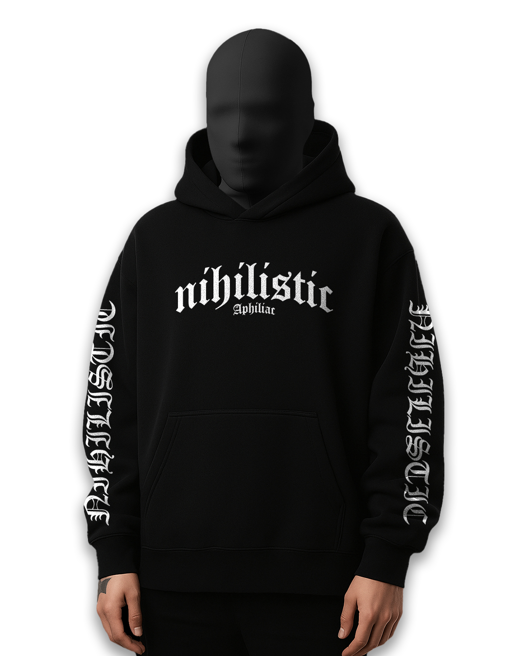 The Nihilism Hoodie brings a monochrome gothic look with sleeve-long typography and a bold front print. Built using 350 GSM super-combed, lint-free cotton fleece, it delivers that dense, premium feel your wardrobe needs.