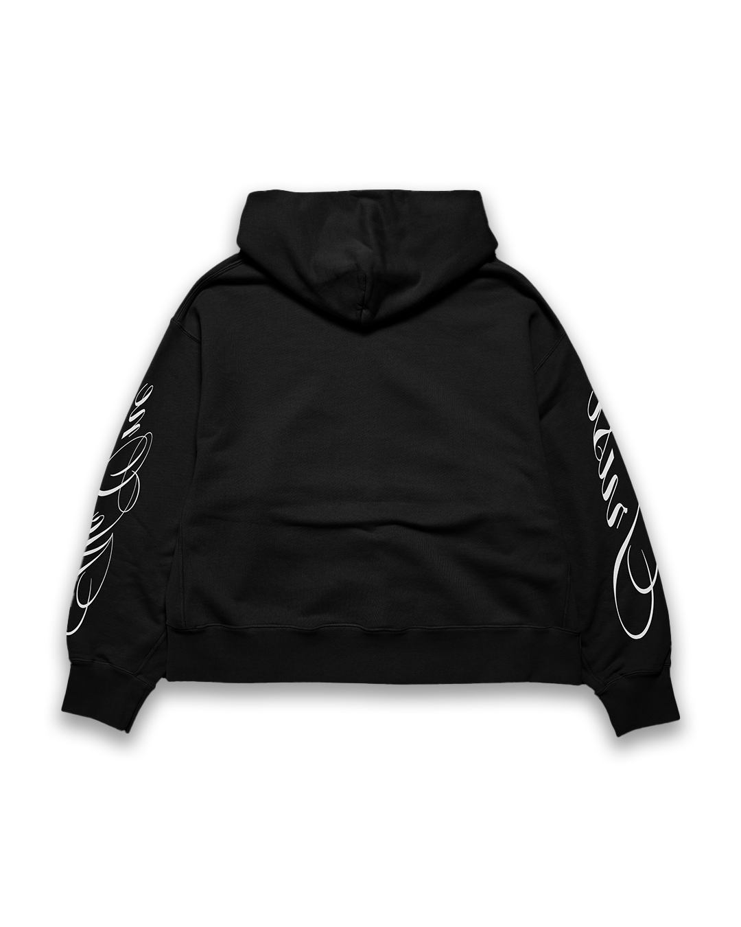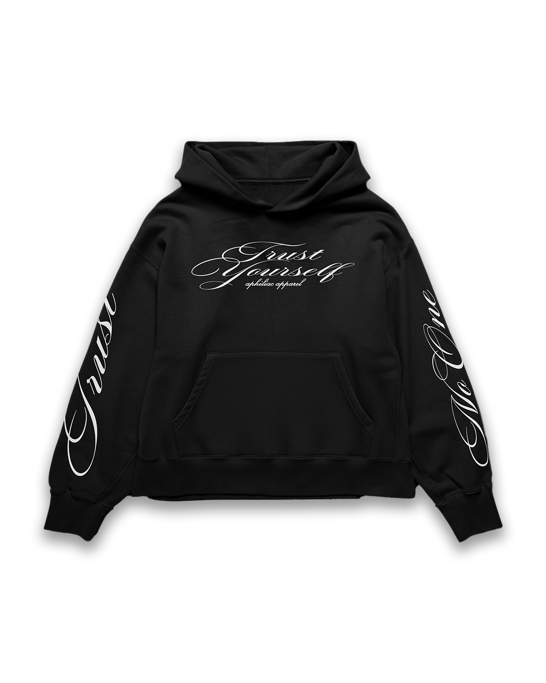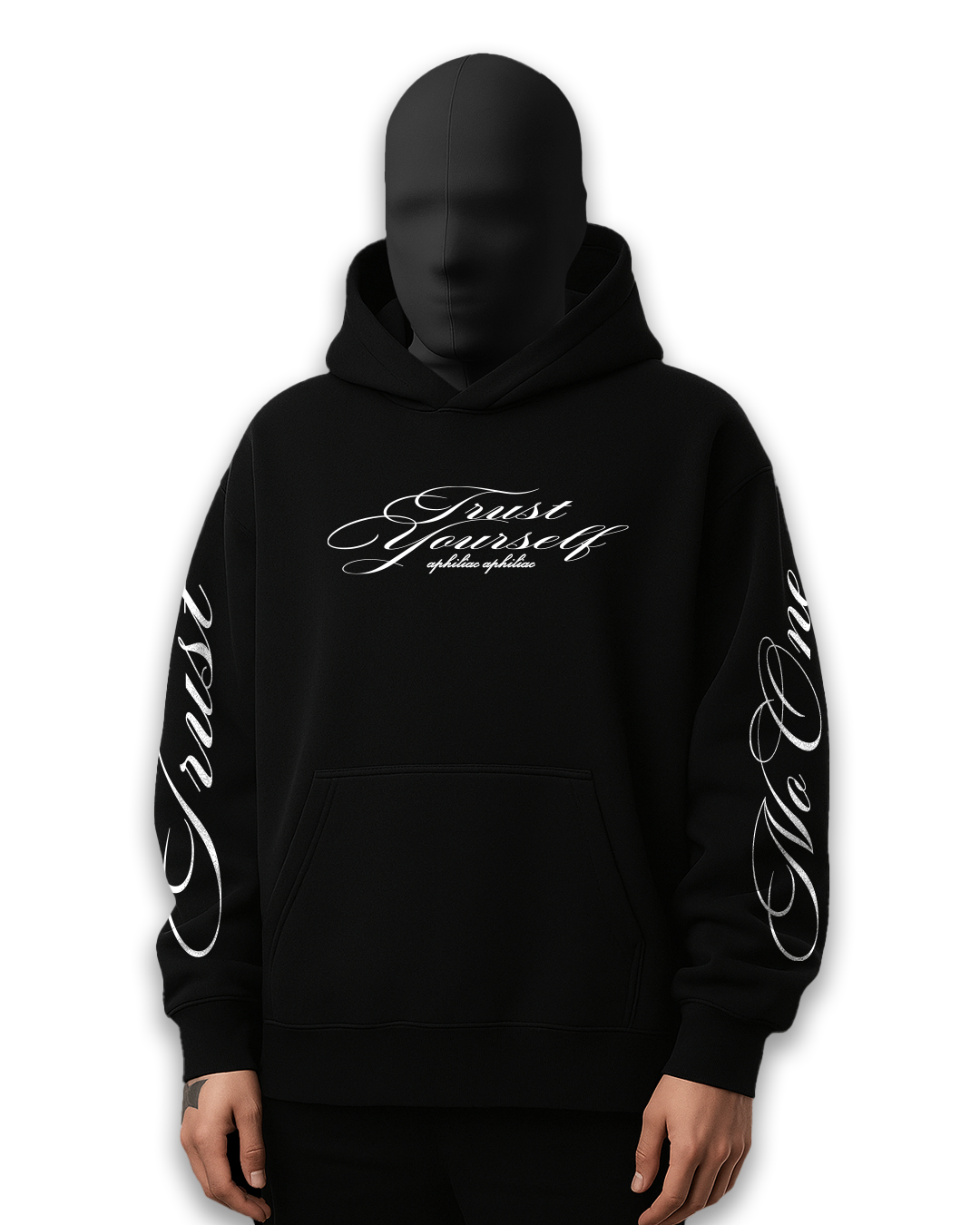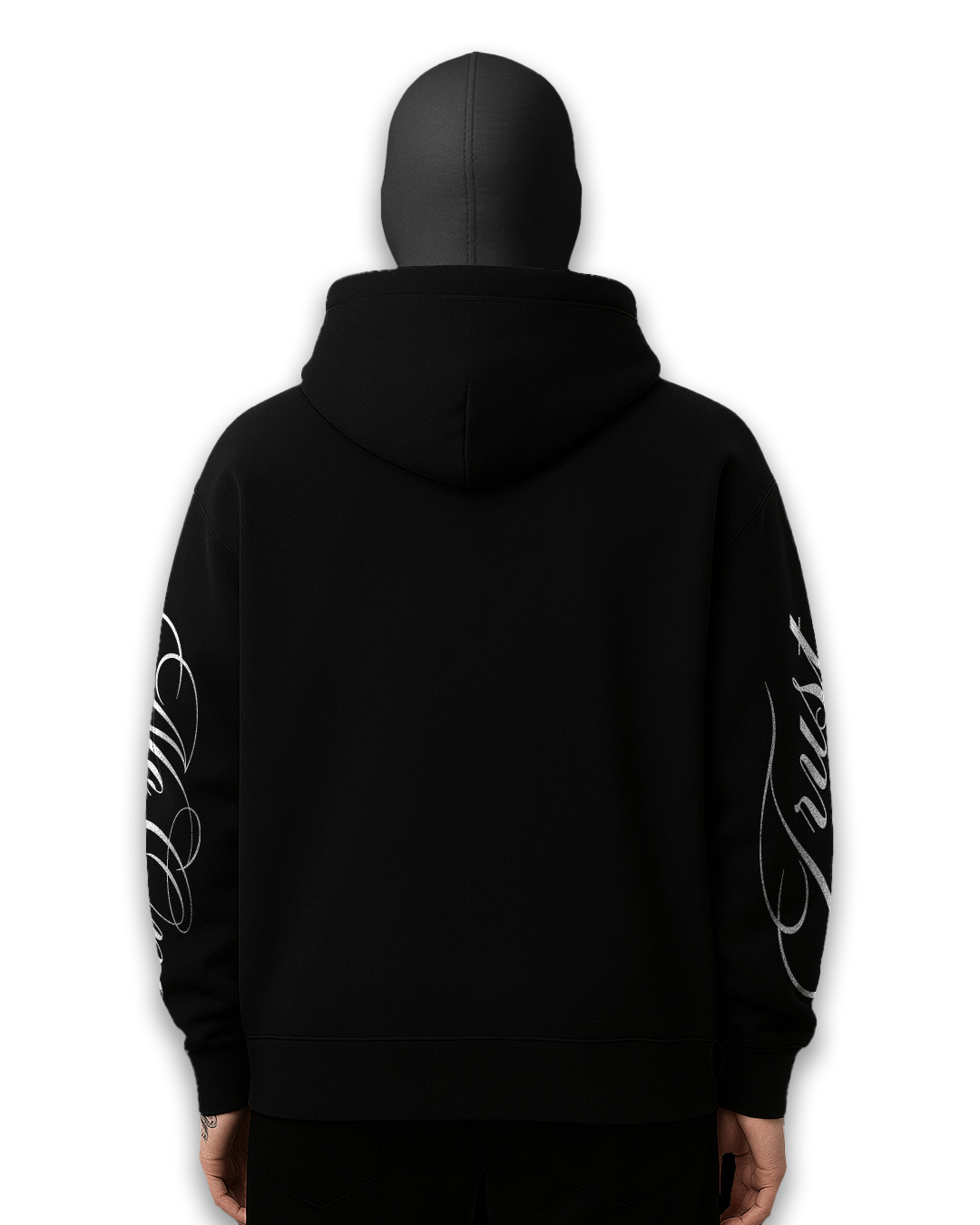 The Trust No One Hoodie features elegant gothic calligraphy across both sleeves and a clean script print on the chest. Crafted from 350 GSM super-combed, lint-free cotton fleece, this hoodie carries a premium weight with a soft inner feel.